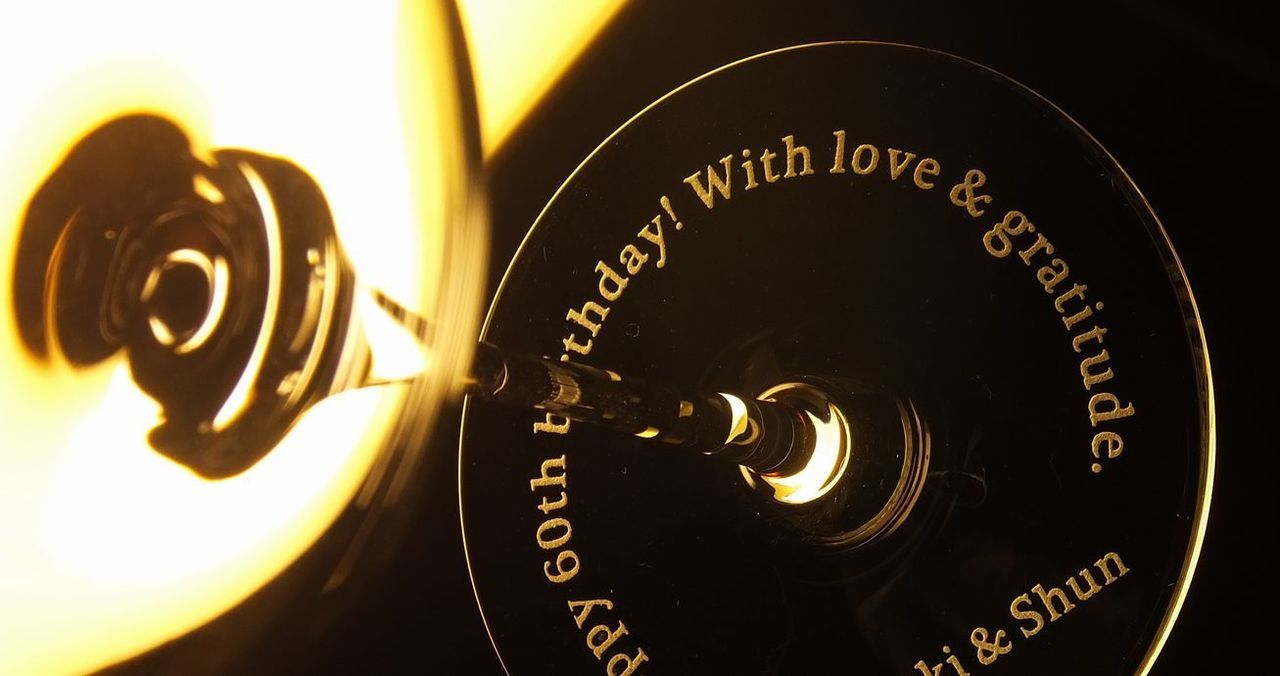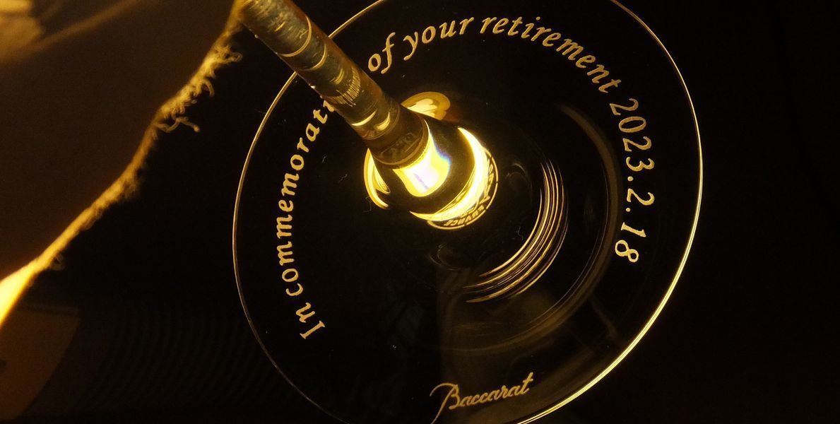 還暦祝いでは、つい「祝・還暦」を入れたくなりますが、商品の輝きを活かすなら、「赤」はグラスの中身(ワインなど)やラッピングで取り入れ、彫刻はあえて透明な削り(素彫り)のみにするのが、センス良く仕上げる秘訣です。バカラのレッドボックスもぴったりのギフトとなります。